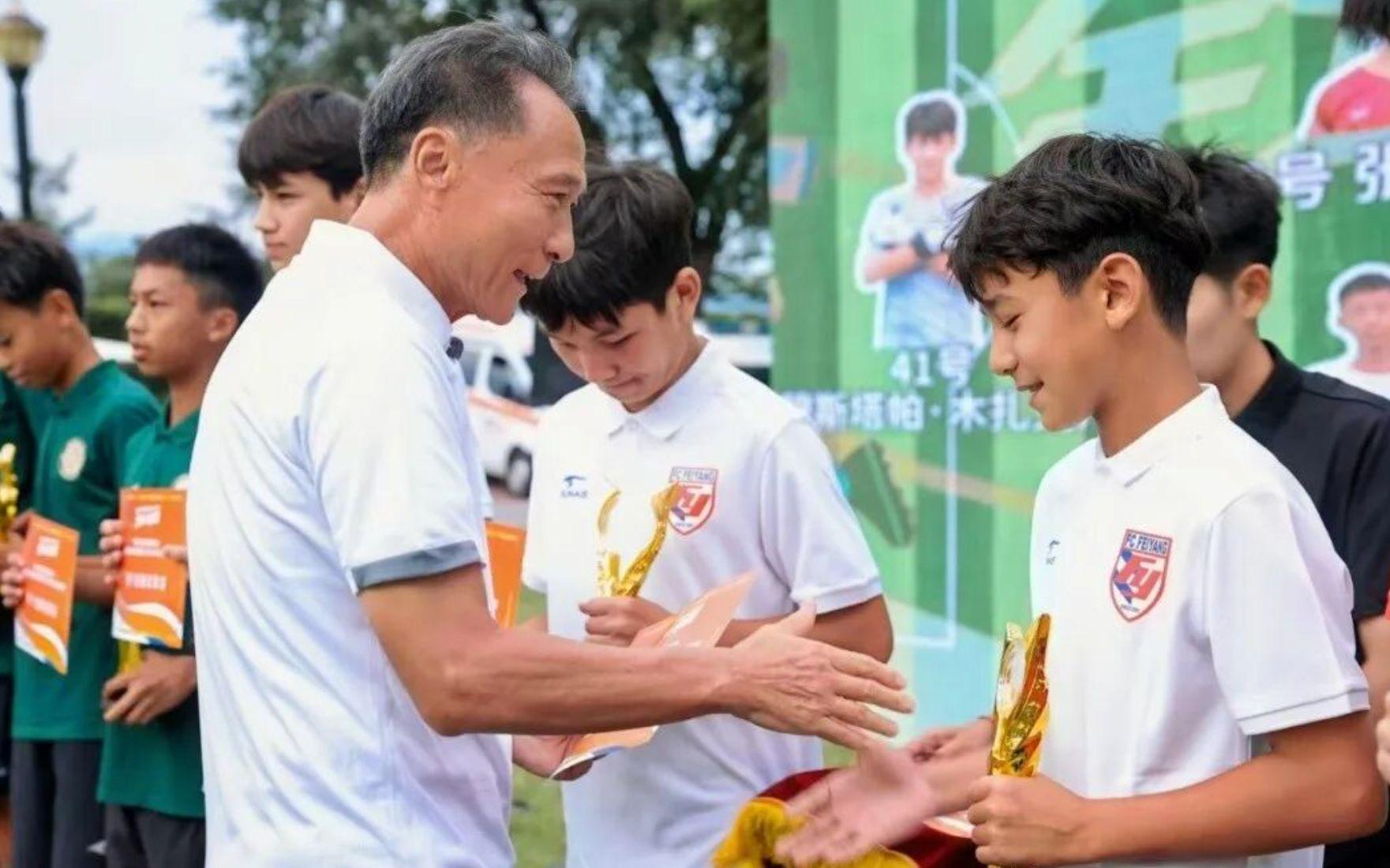 中国足协技术委员会主任沈祥福为小球员颁奖。主办方供图