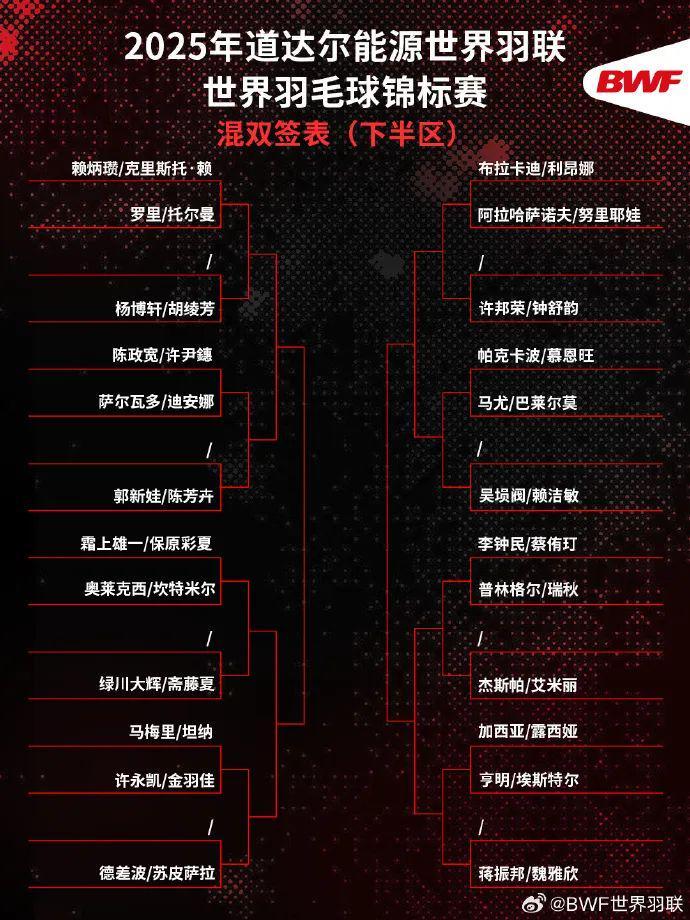 混双方面,国羽共派出4对组合参赛。冯彦哲/黄东萍和程星/张驰同在上半区,冯彦哲/黄东萍在第二轮很有可能遭遇丹麦组合马蒂亚斯/博尔,上一届世锦赛“凤凰”组合正是输给他们。